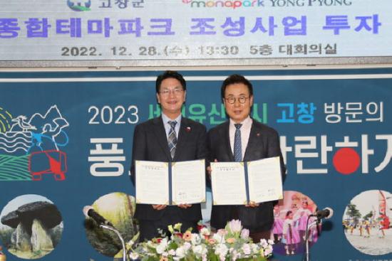 | 심덕섭 군수가 국내 최대 리조트 운영기업인 용평리조트 관계자와 협약을 맺고 있다.(고창군 제공) |