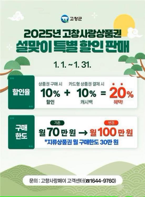 먼저, 카드형 고창사랑상품권을 1월 한 달간 구매 시 10% 선할인 적용하고, 사용액의 10%를 추가 캐시백으로 지원해 최대 20% 할인지원으로 지역 내 소비 촉진을 유도할 방침이다.