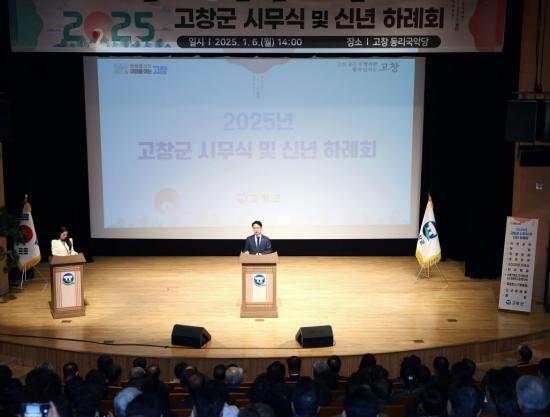 고창군은 이날 오후 2시 고창 동리국악당에서 고창군민, 관내 기관사회단체장 및 임직원 500여명이 참석한 가운데 ‘2025년 고창군 신년하례회’를 열고 새해 출발을 알렸다.