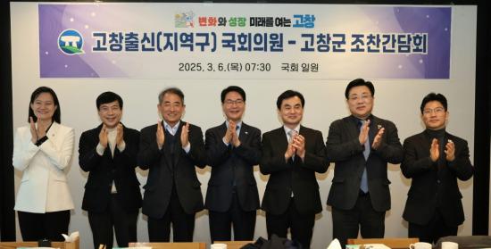 6일 고창군에 따르면 이날 오전 국회에서 고창출신 및 지역구 국회의원 조찬간담회를 열었다. 조찬회에는 심덕섭 고창군수, 고창출신 안규백, 이성윤, 안태준, 김남희, 정을호 국회의원, 지역구 윤준병 국회의원이 참석했다.