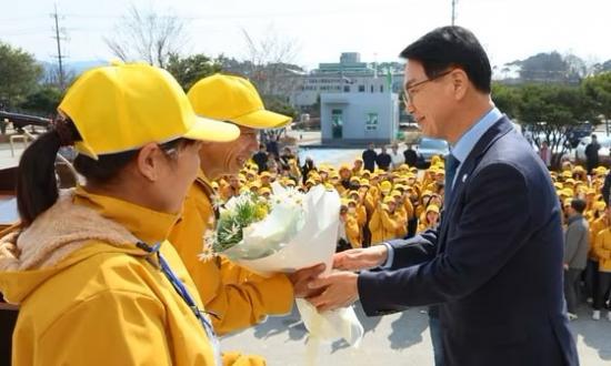| 농촌 일손을 도울 외국인계절근로자 2600명이 입국을 시작했다. 심덕섭 군수가 베트남 계절근로자를 환영하고 있다.(고창군 제공. 재판매 및 DB금지) |