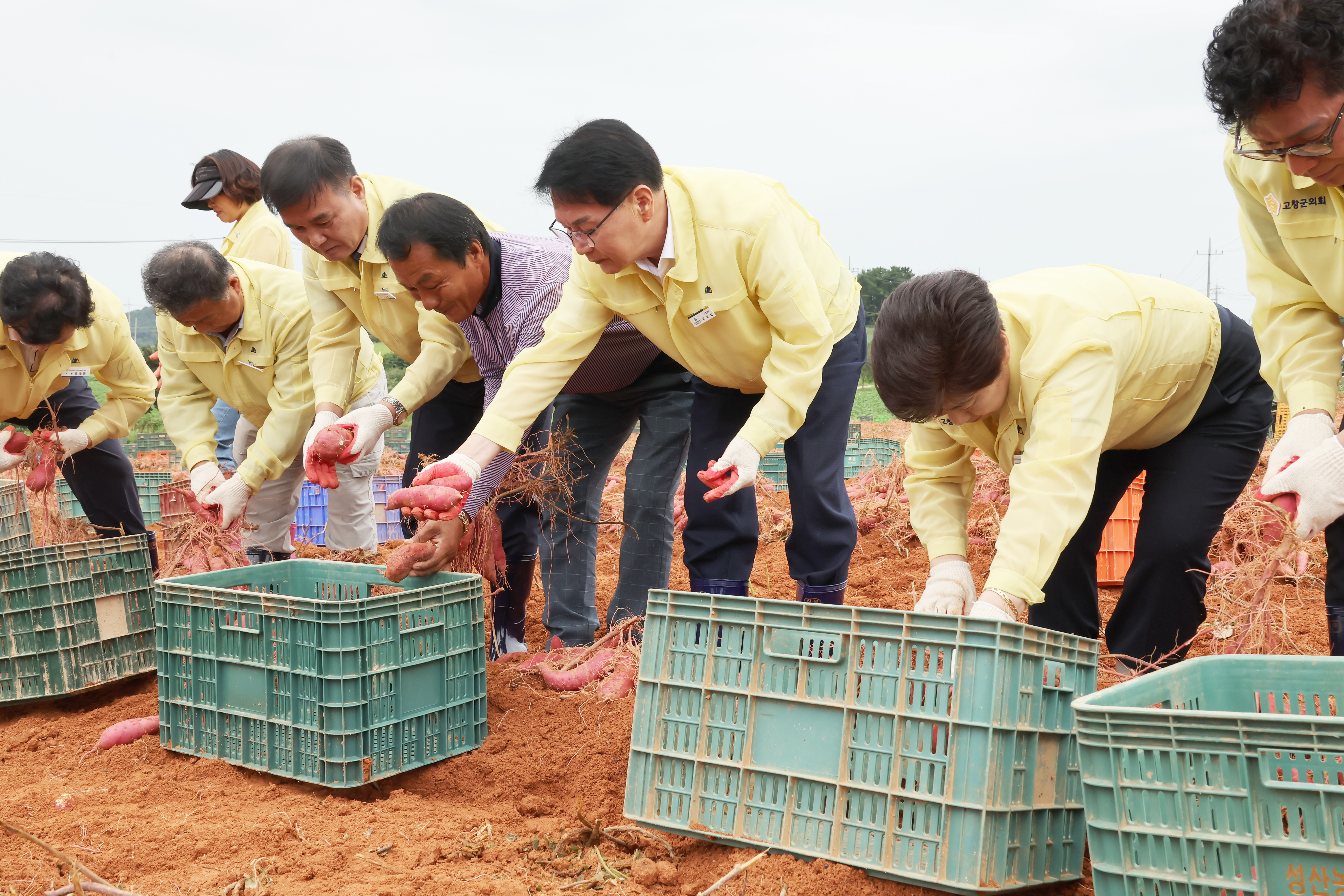 | 심덕섭 고창군수와 조민규 군의장, 군의원들이 공음면 건동리 고구마 수확현장을 방문해 농가일손을 도왔다.(고창군 제공) |