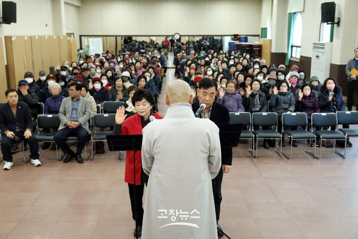 | 고창군노인복지관, 노인일자리 참여자 교육에서 참여자 대표가 선서를 하고 있다.(고창군 제공) |
