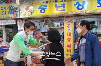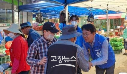 | 무소속 이호근 전북 고창군수 후보가 고창장날인 28일 전통시장에서 유권자를 만나 한표를 호소하고 있다. |