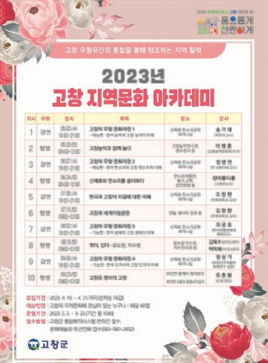 특히 이번 고창 지역문화 아카데미는 ‘2023 세계문화유산도시 고창 방문의 해’를 맞아 고창 군민뿐 아니라 고창 지역문화에 관심이 있는 관외 주민들도 참여할 수 있어 의미를 더한다.
