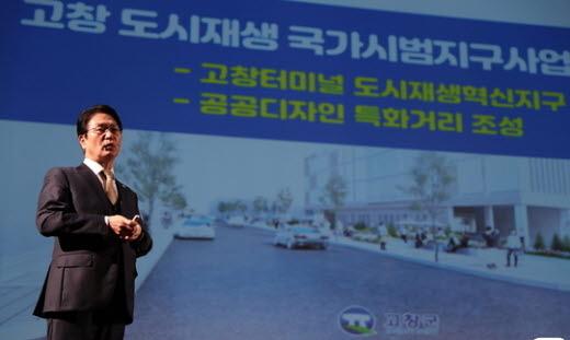 | 심덕섭 고창군수가 터미널 도시재생 혁신지구 국가시범사업 선정에 대해 설명하고 있다.(고창군 제공) |