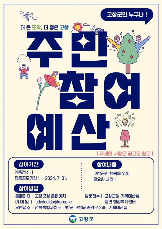 올해 고창군 주민참여예산제는 청소년·청년 등 다양한 계층과 세대의 목소리를 반영하기 위해 집중공모기한을 당초 5월 31일에서 7월 31일로 늘렸다.