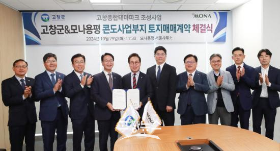 고창군은 29일 서울시 용산센트럴파크에서 심덕섭 고창군수와 신달순 모나용평 대표, 고창군과 업체 관계자들이 참석한 가운데 ‘고창 종합테마파크 토지매입 계약’을 체결했다.