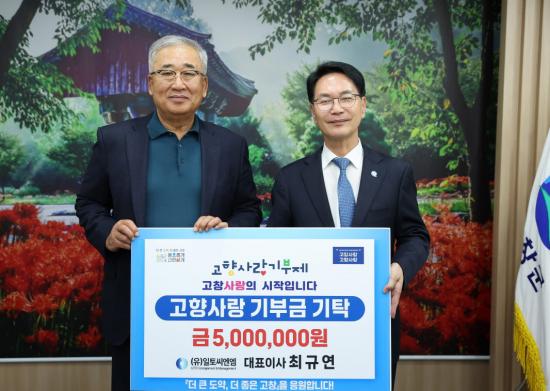 3일 고창군에 따르면 환경기초시설 민간위탁 전문 운영사 (유)일토씨엔엠 최규연 대표와 콘크리트 및 철근 공사업체 (유)한국건설기술공사의 장우찬 과장이 고창군에 각 500만원, 총 1000만원의 고향사랑기부금을 기탁했다.