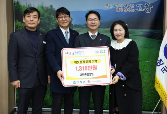 고창종합병원(이사장 조남렬)은 직원들의 십시일반 성금을 모아 총 1316만원을 기탁했으며 생태환경복원업체인 에코탑플러스(대표 김영철)은 500만원, 신도정보통신(대표 박희복)은 300만원, 서우건설(대표 김성수)는 200만원, 고창흑염소협회, 고창군생활개선연합회에서 각각 100만원의 이웃돕기 성금을 전달했다.