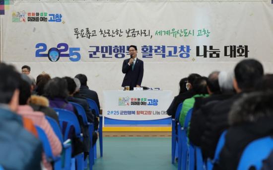 심 군수는 2월 4일까지 나눔대화를 통해 올해 슬로건인 ‘변화와 성장, 미래를 여는 고창’의 의미를 설명하고, 4대 추진방향(서민경제 활성화, 미래첨단산업 육성, 세계유산의 특별한 활용, 안전하고 행복한 삶)을 군민과 함께 공유한다.