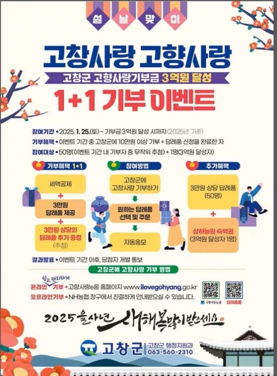 | 고창군이 설을 맞아 고향사랑기부 활성화를 위해 1+1 기부이벤트를 진행한다.(고창군 제공) |