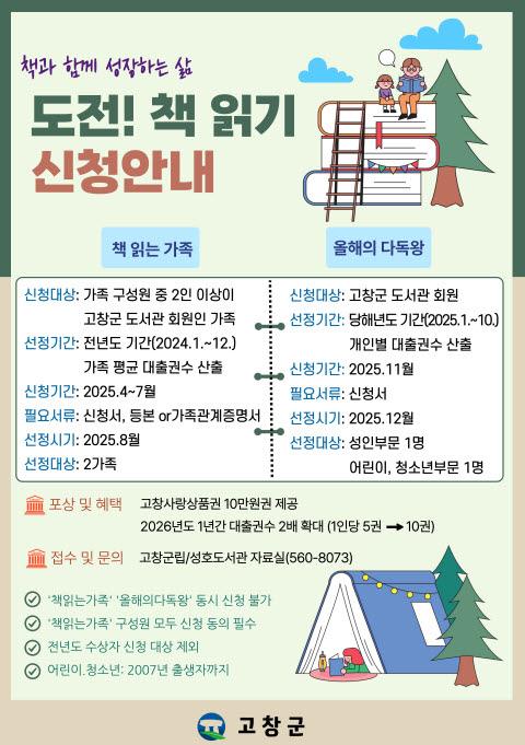 ‘올해의 다독왕’과 ‘책 읽는 가족’으로 선발된 사람에게는 고창사랑상품권 10만원권과 1년간 도서대출 권수 2배(5권→10권) 혜택이 주어진다.