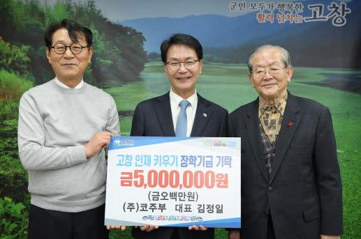 고창군은 ㈜코주부 김정일 대표가 500만원을, 조봉균 (유)일신건설 대표가 100만원을 지역 인재 육성을 위해 써달라며 장학금을 기탁했다고 9일 밝혔다.