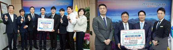 | 고창군에 이웃돕기 성금품 기탁이 이어지고 있다. 4-H연합회(사진 왼쪽)와 골프존문화재단 골프존카운티선운(고창군 제공. 재판매 및 DB금지) |