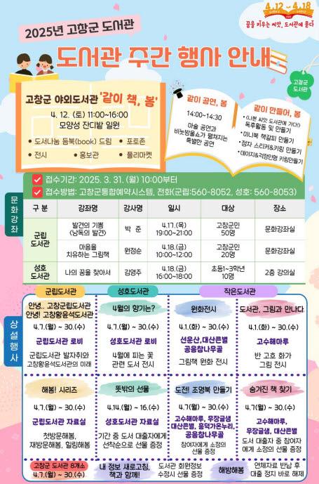 고창군도서관은 13일 2025 고창군 야외도서관 ‘같이 책, 봄’ 행사를 오전 11시부터 오후 4시까지 고창읍성 잔디광장에서 진행한다.