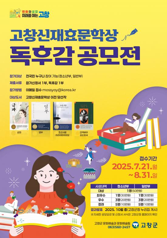 나윤옥 고창군 문화예술과장은 “독후감 공모전을 통해 고창신재효문학상의 대내외적인 홍보와 글쓰기의 즐거움을 확산시킬 수 있기를 기대한다”며 “전국을 대상으로 고창의 위상을 높이고 다양한 문화콘텐츠 활용을 위해 최선을 다하겠다”고 말했다.
