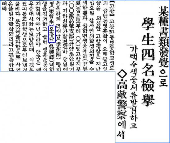 | ‘동아일보’ 1929년 6월 27일자 중 오흥탁 선생이 고창고등보통학교 동맹휴학 사건으로 학우들과 함께 체포된 내용이 기술되어 있다.(고창군 제공) |