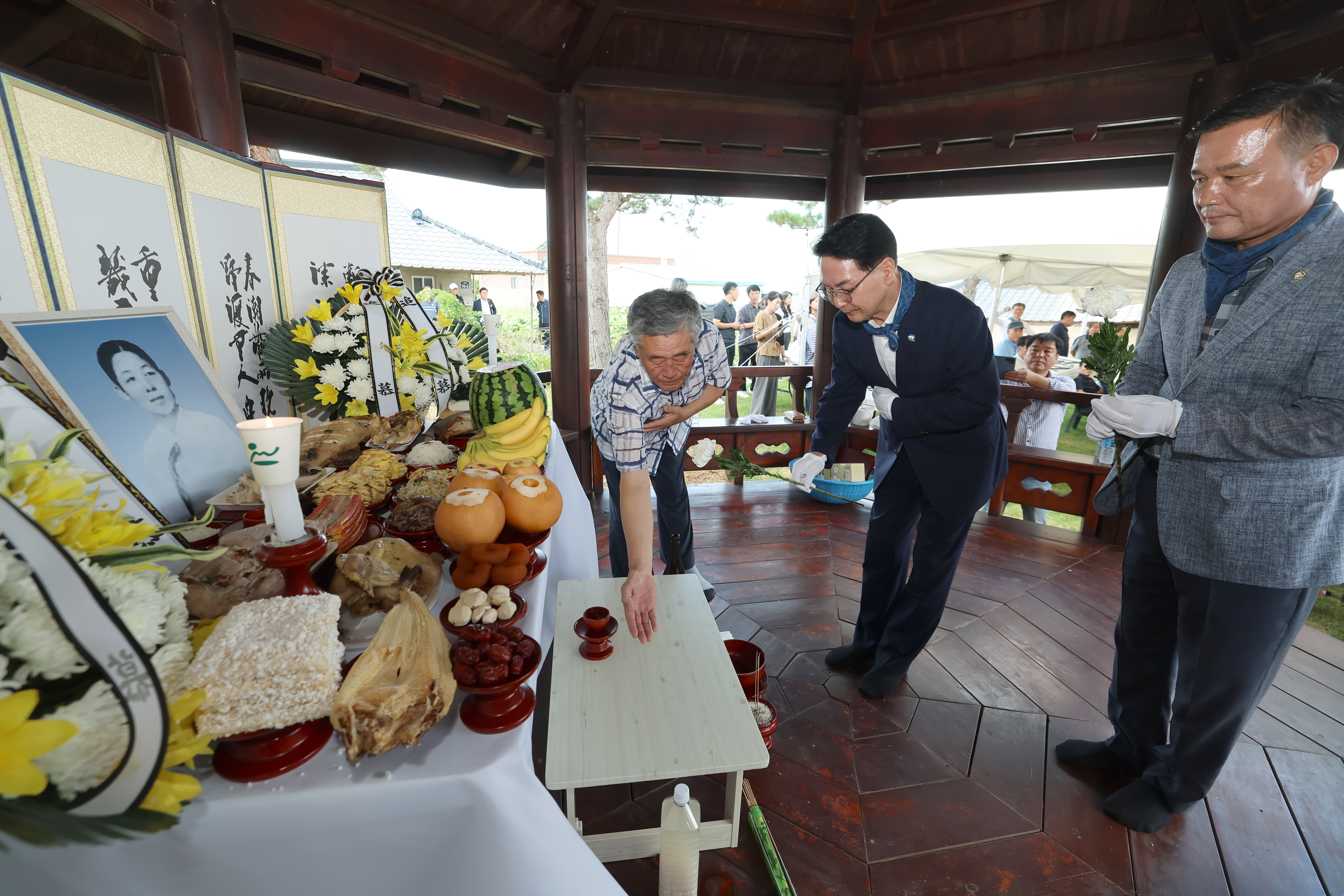 | 심덕섭 군수와 조민규 군의장이 진채선 명창에 헌화하고 있다. |