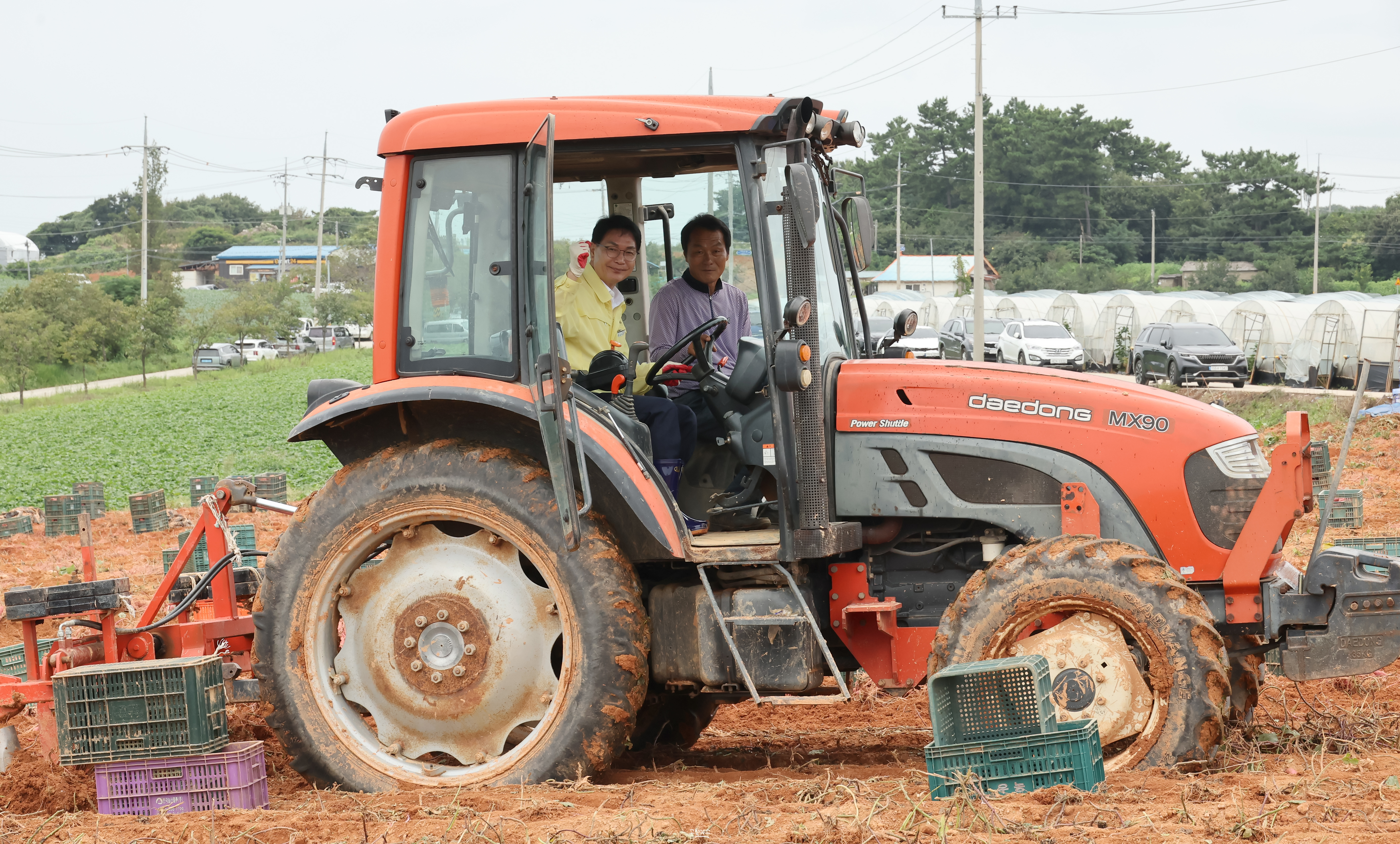 | 심덕섭 고창군수와 조민규 군의장, 군의원들이 공음면 건동리 고구마 수확현장을 방문해 농가일손을 도왔다.심덕섭 군수가 수확용 트랙터를 몰고 있다.(고창군 제공) |