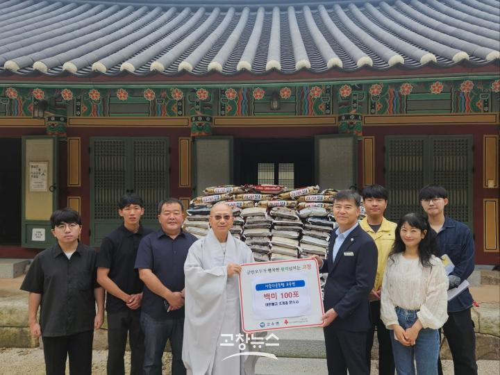 | 2일 오전 고창군 고수면 문수사에서 열린 ‘이웃사랑 백미 기탁식’에서 태효 주지스님과 유성룡 고수면장과 직원들이 기념사진을 찍고 있다. |