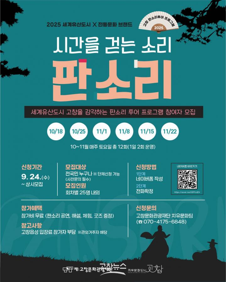 이문식 고창문화도시센터장은 “유형유산과 무형유산이 만나는 고창만의 독창적인 문화여행으로, 참여자가 직접 걷고 듣고 체험하며 고창의 전통을 감각할 수 있는 프로그램”이라며 “판소리의 본고장 고창의 품격 있는 문화 브랜드로 발전시킬 계획”이라고 밝혔다.