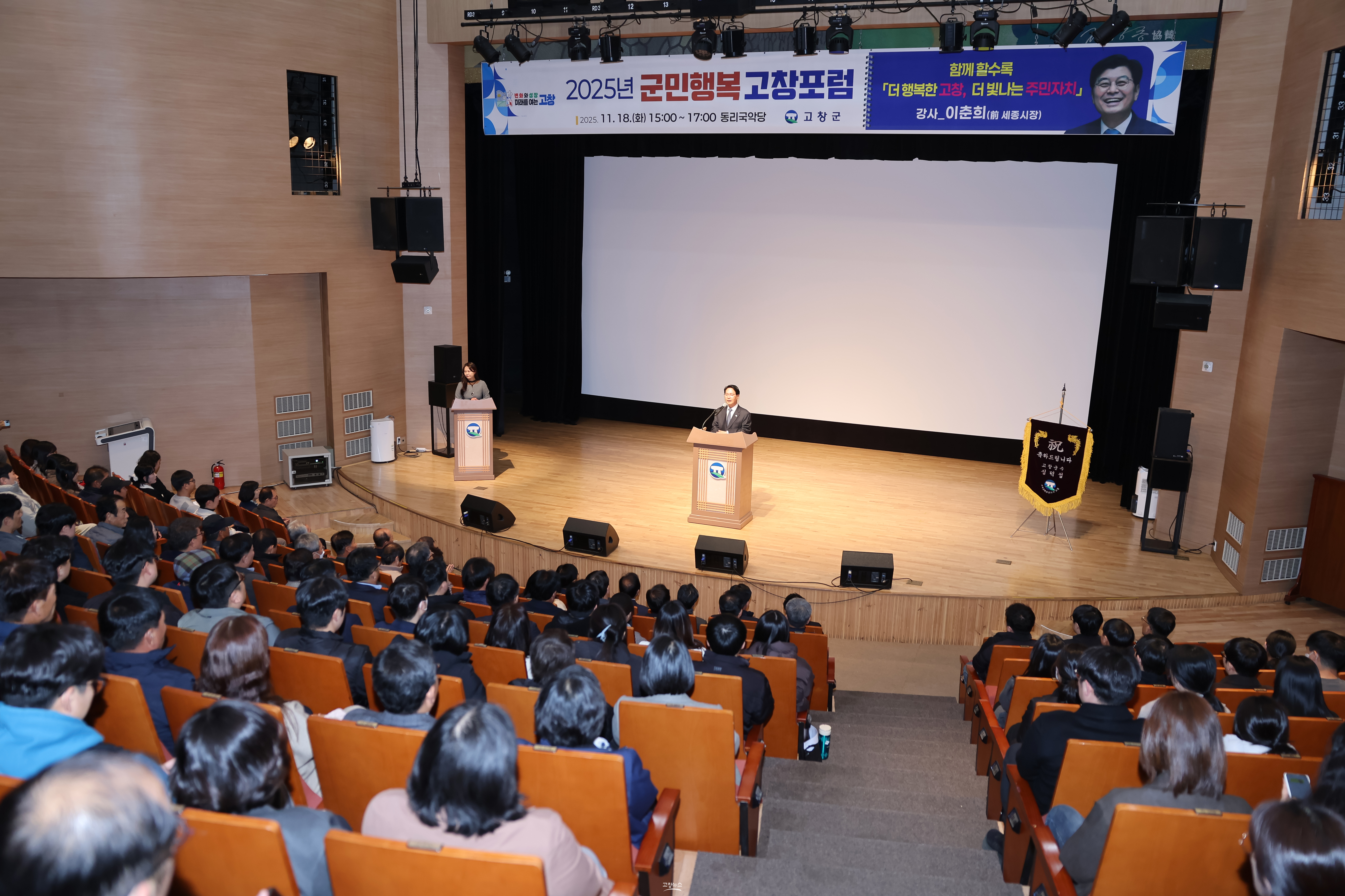 고창군이 18일 오후 동리국악당에서 고창군 해리면 출신인 이춘희 전 세종시장을 초청해 ‘함께 할수록 더 행복한 고창, 더 빛나는 주민자치’를 주제로 군민 포럼을 열었다.