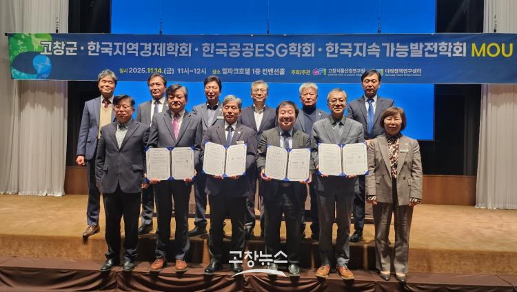 | 고창군이 14일 고창웰파크호텔에서 한국지역경제학회(회장 김봉원), 한국공공ESG학회(회장 사득환), 한국지속가능발전학회(회장 오수길) 등 3개의 학술기관과 함께 지역소멸 대응 및 농촌정책의 방향과 전략 마련을 위한 업무협약(MOU)을 맺었다.2025.11.14/고창뉴스 |