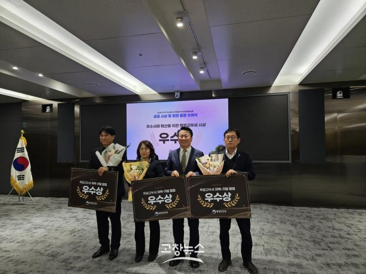 | 고창군이 행정안전부 주관 ‘2025년 지역-기업 협업 우수사례 발표대회’에서 우수상을 받았다. 유창형(맨 오른쪽) 고창군 행정지원과장이 시상식에서 우수상을 받고 있다.(고창군 제공) |