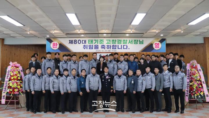 고창경찰서는 지난 29일 고창경찰서 4층 대강당에서 과·지역관서장, 계·팀장 등 직원 50여 명이 참석한 가운데 제80대 태기준 서장(총경) 취임식을 개최했다.