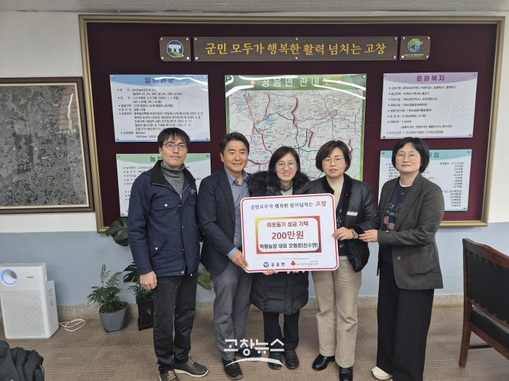 김애숙 공음면장은 “지역을 대표하는 농업인으로서 꾸준히 나눔을 실천해 주시는 오형준 대표와 진수연 부부께 깊이 감사드린다”며 “기탁된 성금은 도움이 꼭 필요한 이웃들에게 정성껏 전달하겠다”고 밝혔다.
