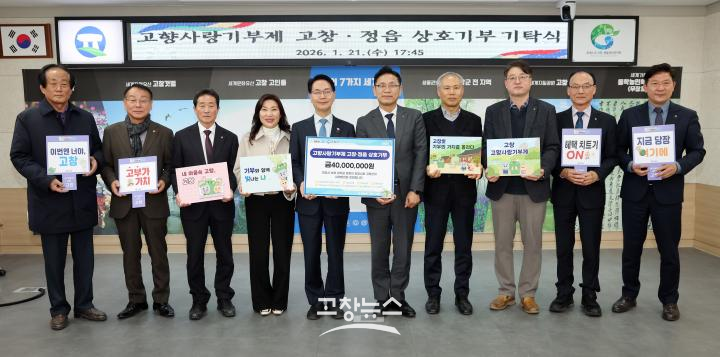 고창군과 정읍시 농·축협 조합장 및 시·군지부장들은 21일 고창군청에서 고향사랑기부금 상호 기탁식을 갖고, 두 지역에 총 4000만 원의 기부금을 전달했다.