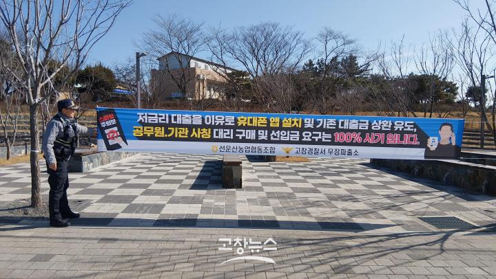 무장파출소와 선운산농협은 최근 관내에서 8천만 원대 전화금융사기 피해가 발생하는 등 보이스피싱과 노쇼 사기가 잇따르자, 추가 피해를 막기 위해 주민 왕래가 잦은 주요 교차로를 중심으로 예방 홍보 플래카드를 제작·게시했다.