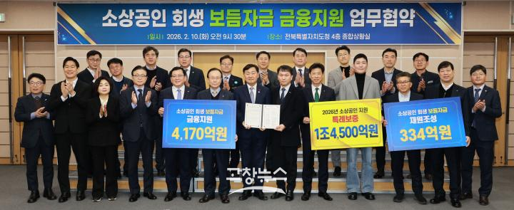 도는 10일 도청에서 김관영 도지사를 비롯해 한종관 전북신용보증재단 이사장, 11개 시군, 8개 금융기관, 소상공인연합회가 참석한 가운데 ‘2026년 소상공인 회생 보듬자금 지원사업’ 업무협약을 체결했다.