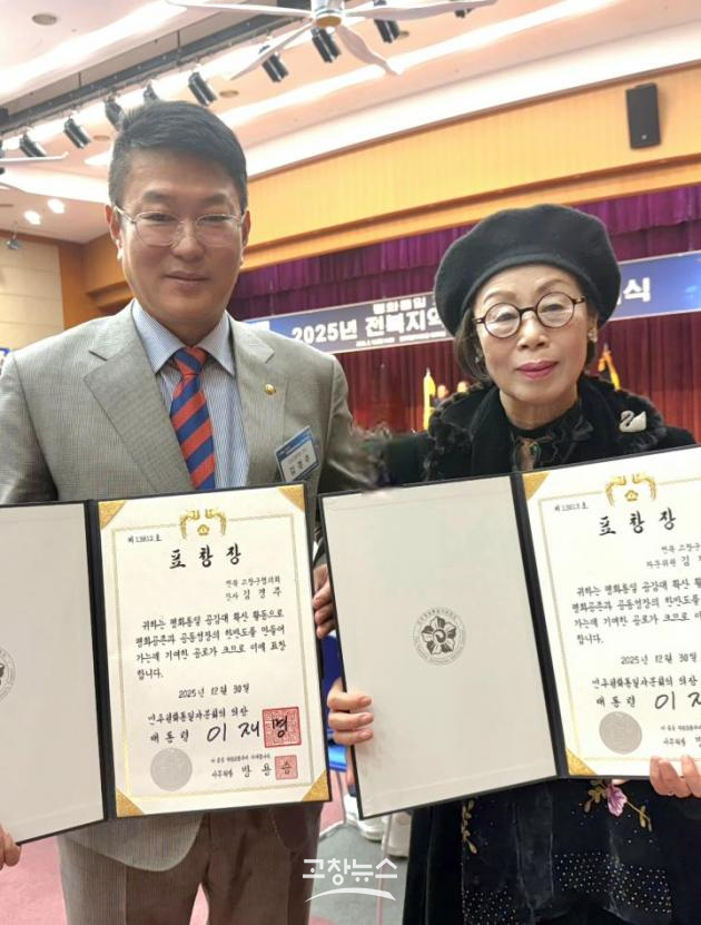 | 민주평화통일자문회의 고창군협의회(회장 박영택) 김경주 간사와 김재임 자문위원이 10일 전북특별자치도청에서 열린 ‘2025년 전북지역 의장 표창 수여식’에서 의장(대통령) 표창을 받았다.(민주평통 제공) |