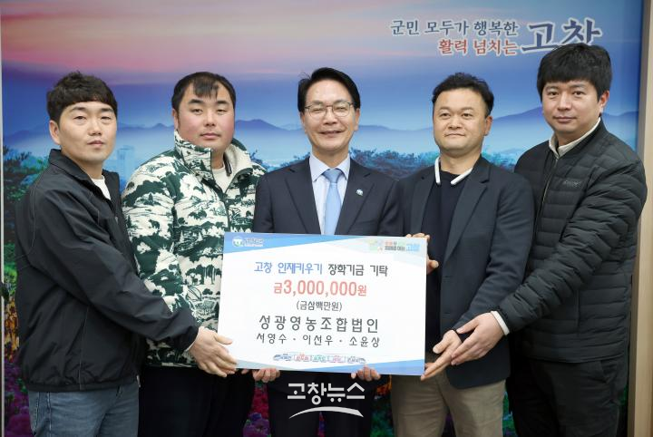 (재)고창군장학재단은 5일 성광영농조합법인 서영수 대표와 이선우, 소윤상 씨가 지역 학생들의 밝은 미래와 성장을 응원하는 뜻을 담아 장학금 300만원을 전달했다고 밝혔다.