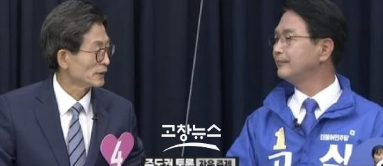 | 지난 2022년 6ㆍ1 지방선거에서 당시 유기상 후보(당시 무소속)와 심덕섭 후보(더불어민주당)가 JTV가 주관한 토론회에서 열띤 논쟁을 벌이고 있다.(JTV 갈무리, 고창뉴스/DB) |