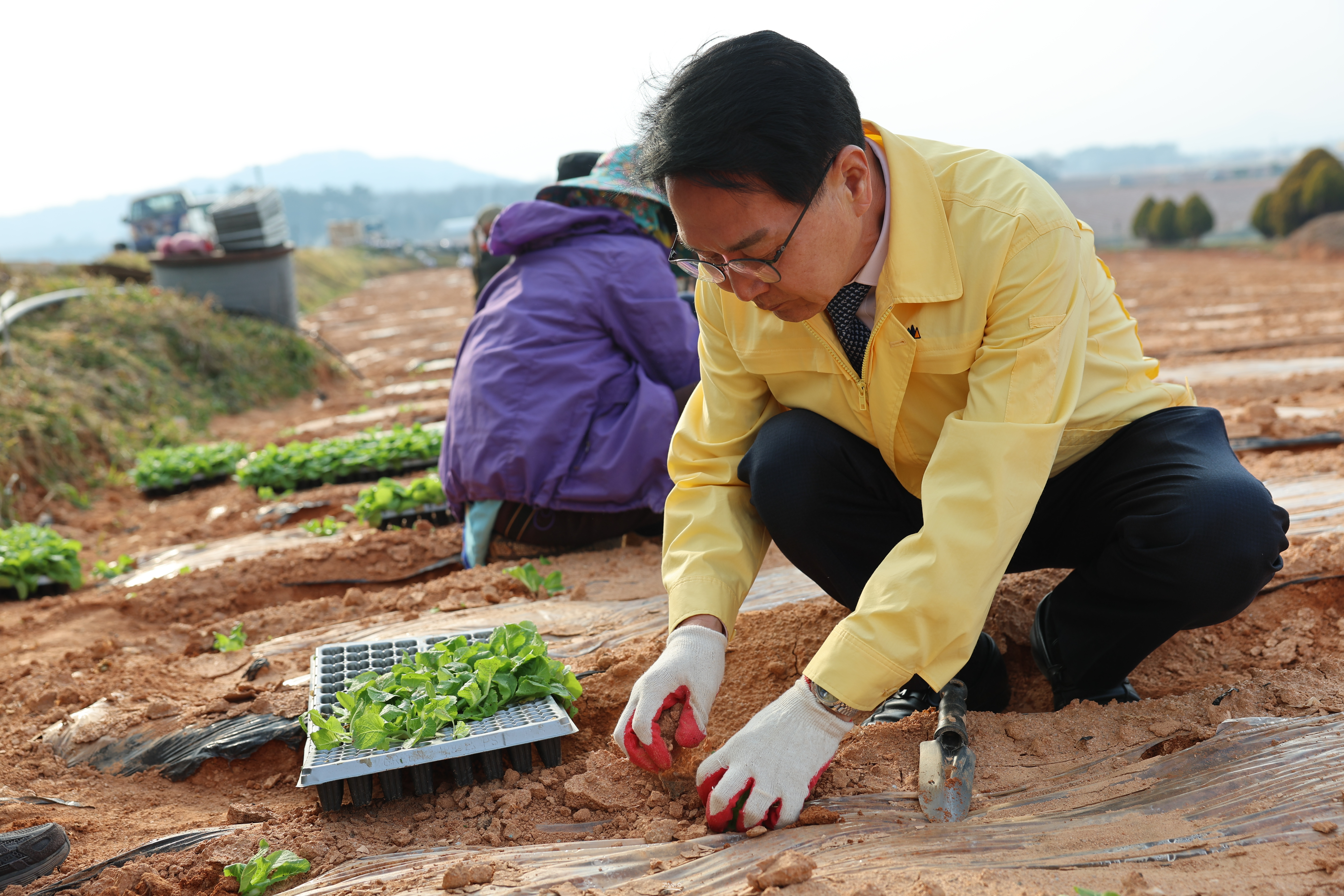 이어 대산면 연동리 일원의 배추 재배 현장을 방문해 봄배추 생육상황과 재배 여건을 점검하고 김치산업 경쟁력 강화를 위한 현장 대응에 나섰다.