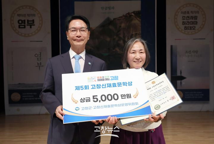 | 고창군은 18일 오후 동리국악당에서 ‘제5회 고창신재효문학상’ 시상식을 개최하고, 수상자인 이강원 작가와의 대화 시간을 통해 군민들과 소통하는 시간을 가졌다. 심덕섭 군수가 시상하고 있다.(고창군 제공) |