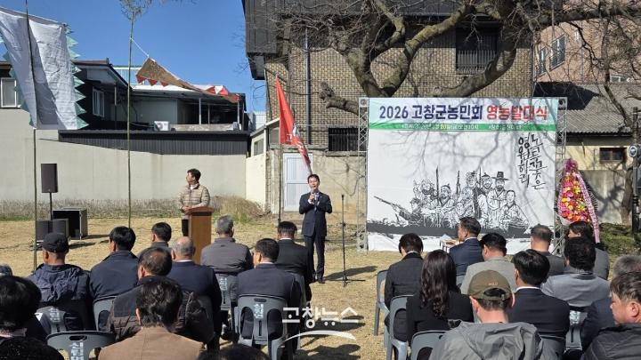 | 고창군농민회 영농발대식에서 심덕섭 군수가 인삿말을 하고 있다(고창군 제공) |