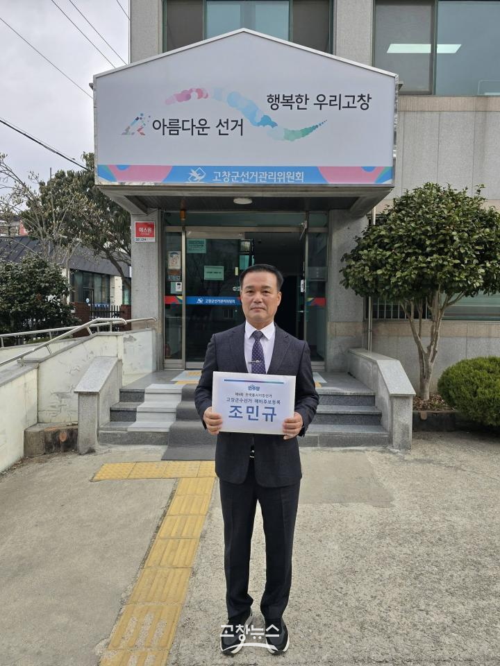 | 조민규 의장이 22일 오전 고창군선거관리위원회에 제9회 전국동시지방선거 고창군수 예비후보 등록을 마치고 본격적인 선거운동에 돌입했다. |