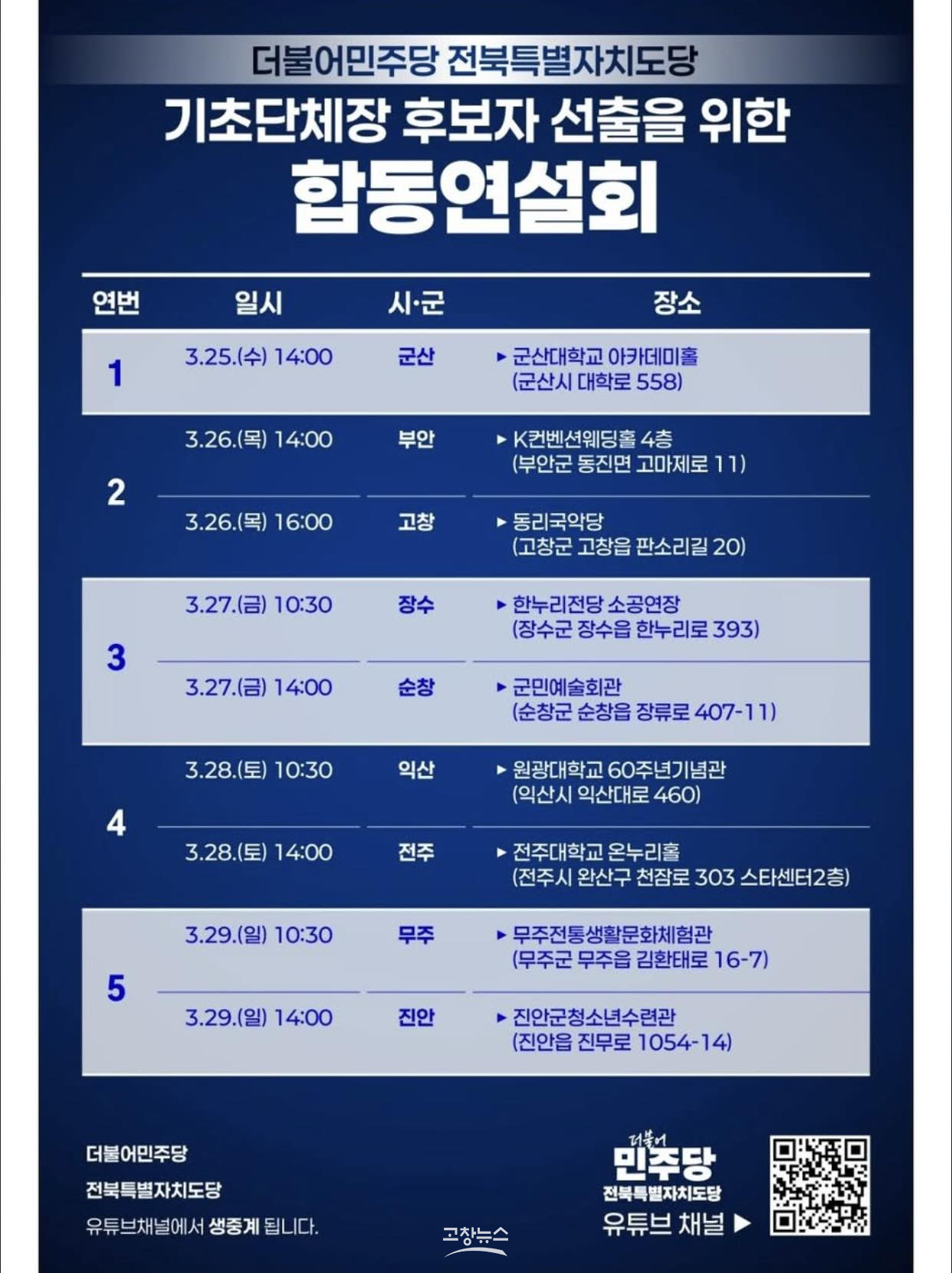 고창 지역 연설회는 오는 26일 오후 4시 동리국악당에서 열릴 예정으로, 당원과 군민들의 높은 관심이 예상된다.