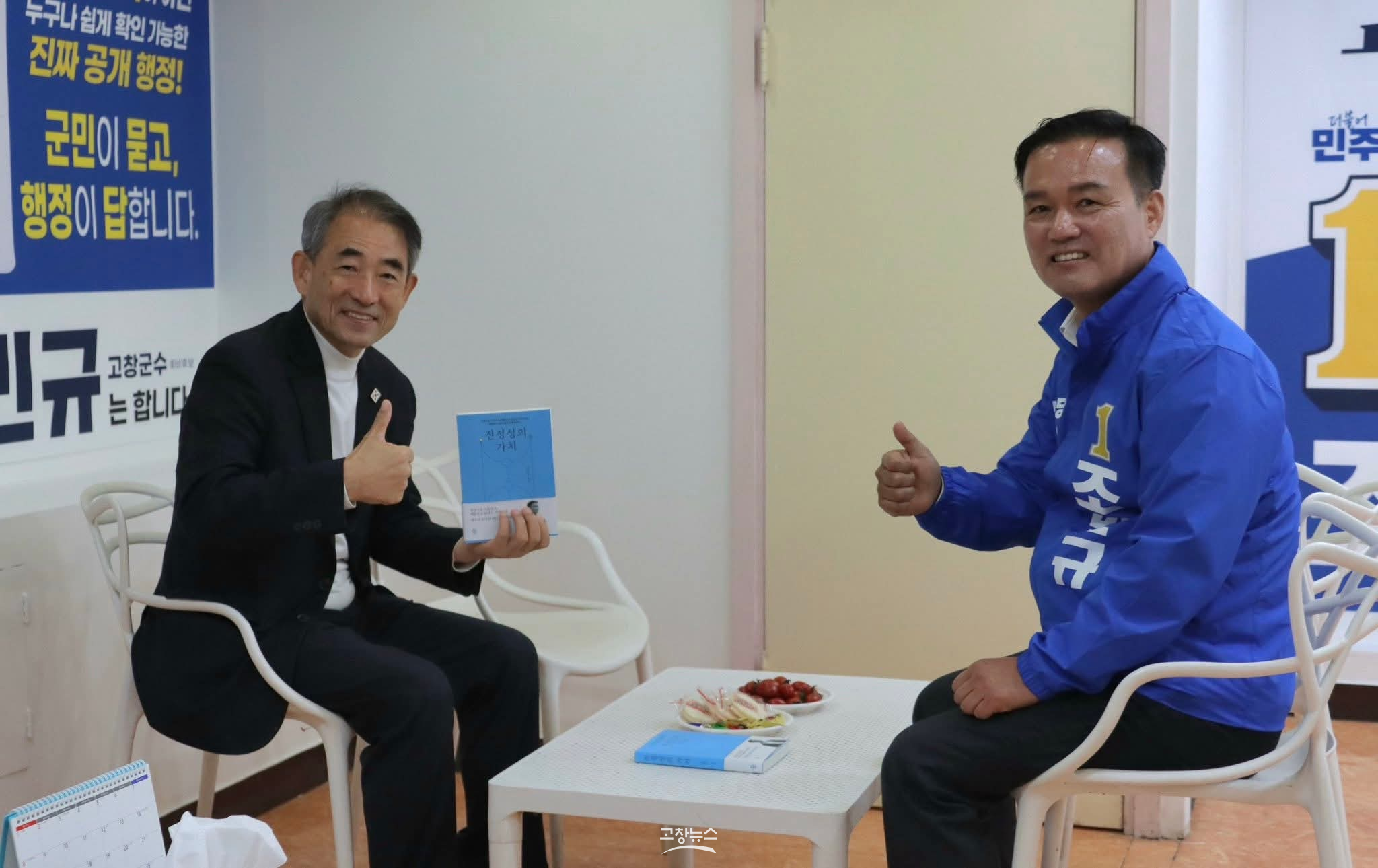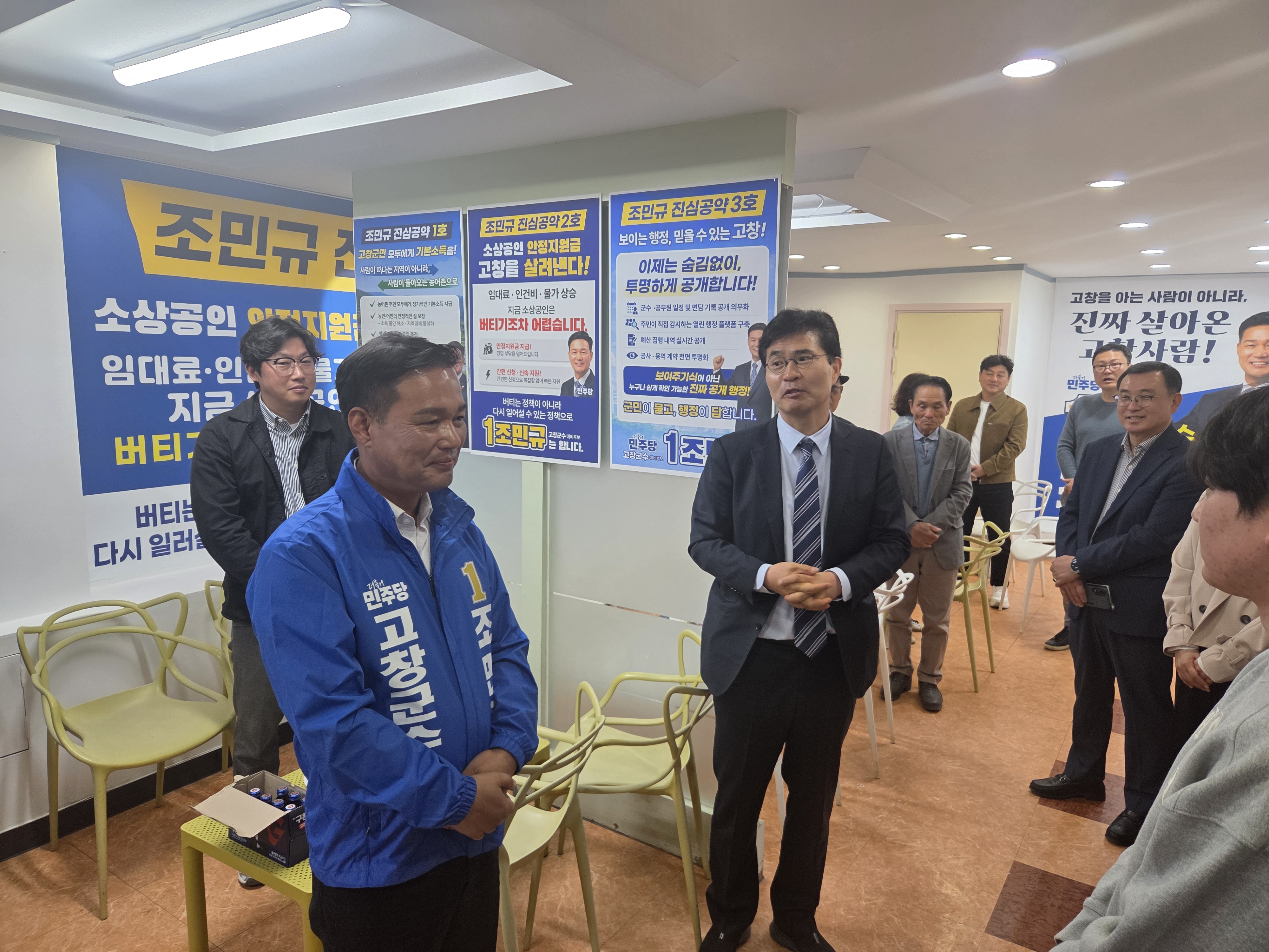 | 조민규 예비후보는 28일 오전 고창읍 터미널 부지 인근 선거사무소에서 개소식을 열고, 지역 발전을 위한 비전과 공약을 제시하며 본격적인 선거 행보의 시작을 알렸다. 조 예비후보가 개소식에서 윤준병 전북도당위원장과 대화를 하고 있다. |