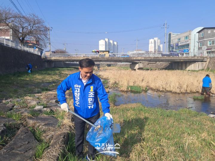 | 조민규 예비후보가 28일 오전 고창읍 터미널 부지 인근 선거사무소에서 개소식을 열고, 지역 발전을 위한 비전과 공약을 제시하며 본격적인 선거 행보의 시작을 알렸다. 조 예비후보가 개소식에 앞서 고창천 환경정화 활동을 하고 있다. |