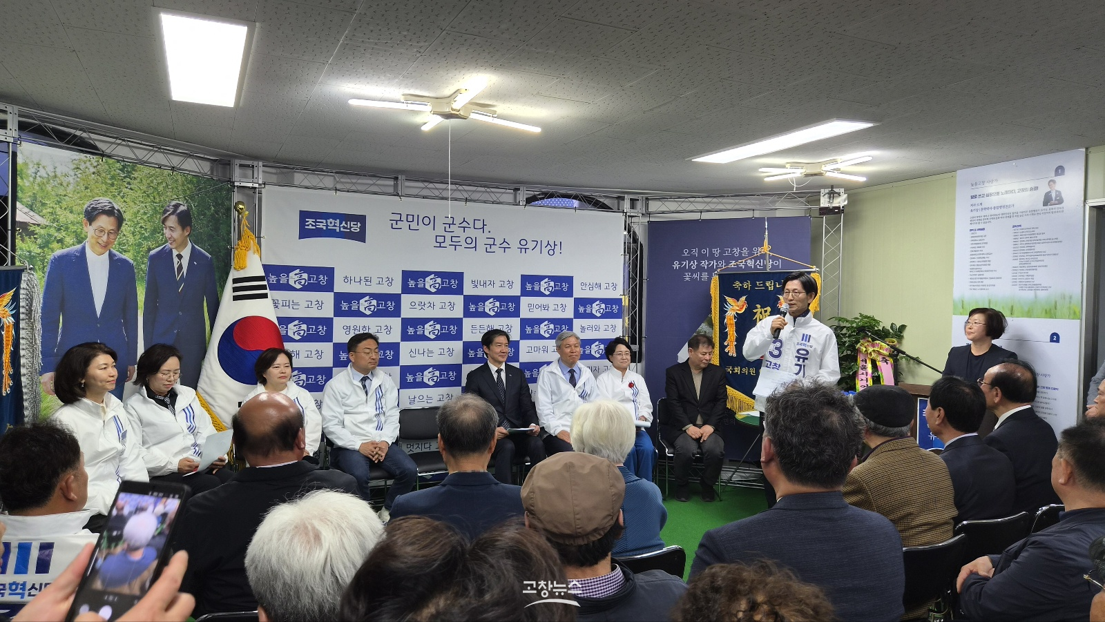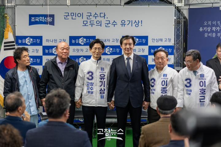 | 유기상 조국혁신당 고창군수 예비후보가 11일 터미널부근에 위치한 동방빌딩에서 선거사무소 개소식을 열고 본격적인 선거전에 돌입했다. 조국혁신당 조국 대표가 유기상 예비후보 선거 개소식에 참석해 조국혁신당 소속 예비후보들의 선전을 다짐하고 있다.2026.4.11/고창뉴스 |