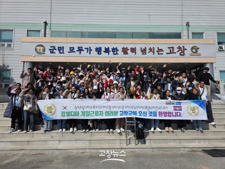 | 고창군의 외국인 계절근로자 입국이 비교적 안정적으로 진행되며 전북 시·군 가운데 상위권 입국률을 기록하고 있다. 사진은 캄보디아 근로자 입국 환영식 자료사진(고창뉴스/DB) |