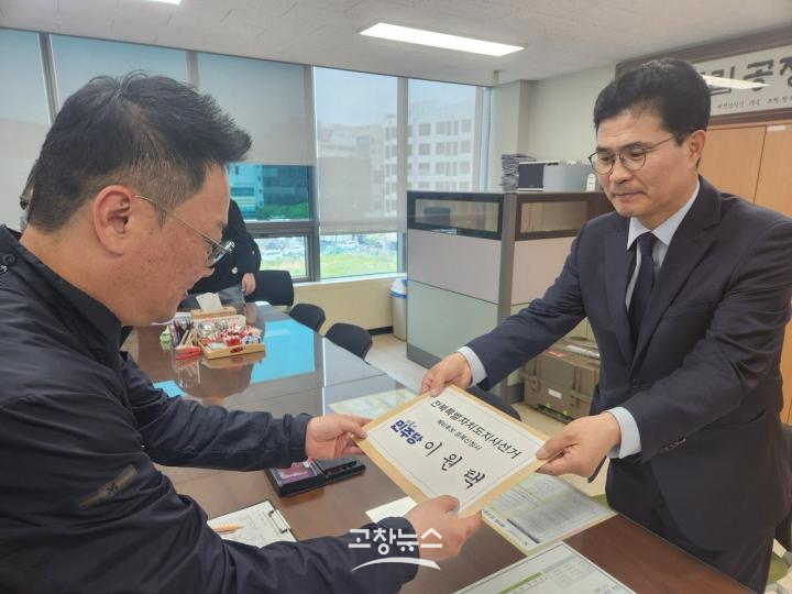 | 더불어민주당 이원택 전북특별자치도지사 예비후보가 29일 도 선관위를 방문해 예비후보 등록을 하고 있다.(캠프 제공) |