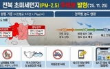 탑뉴스 고창뉴스 박제철 기자2025. 12.30[고창뉴스]전북특별자치도 보건환경연구원은 25일 오전 전북 서부권과 중부권에 국외 오염물질 유입의 영향으로 초미세먼지(PM-2.5) 농도가 높아지며 초미세먼지 주의보를 발령했다고 밝혔다. 초미세먼지(PM-2.5) 주의보는 시간 평균 농도가 2시간 이상 75㎍/㎥을 넘길 때 발령된다. 이날 고창을 포함한 서부권역은 오전 9시 99㎍/㎥, 10시 84㎍/㎥, 중부권역은 오전 10시 81㎍/㎥, 11시 83㎍/㎥를 기록하며 기준치를 초과했다. 이번 주의보는 중부와 남서부 지역을 중심으로 오전까지 국외 미세먼지가 유입되면...