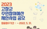산업경제 고창뉴스2022. 06.13고창군이 주민참여예산제도의 일환으로 2023년 예산 반영을 위해 13억원의 예산을 편성한다고 11일 밝혔다. 접수된 주민제안사업은 사업 구체화, 주민참여예산위원회 심사, 온라인 주민투표 등을 거쳐 예산안에 반영되고 고창군의회의 심의를 받게 된다. 사업부서 검토와 위원회 심사 등 숙의 과정을 통해 사업을 구체화하고, 이를 통해 소중한 주민들의 제안을 최대한 군 예산에 반영시킬 방침이다. 이에 따라 고창군은 5월말까지 주민제안사업을 신청 받는다. 제안을 희망하는 고창군민은 누구나 참여가 가능하다...